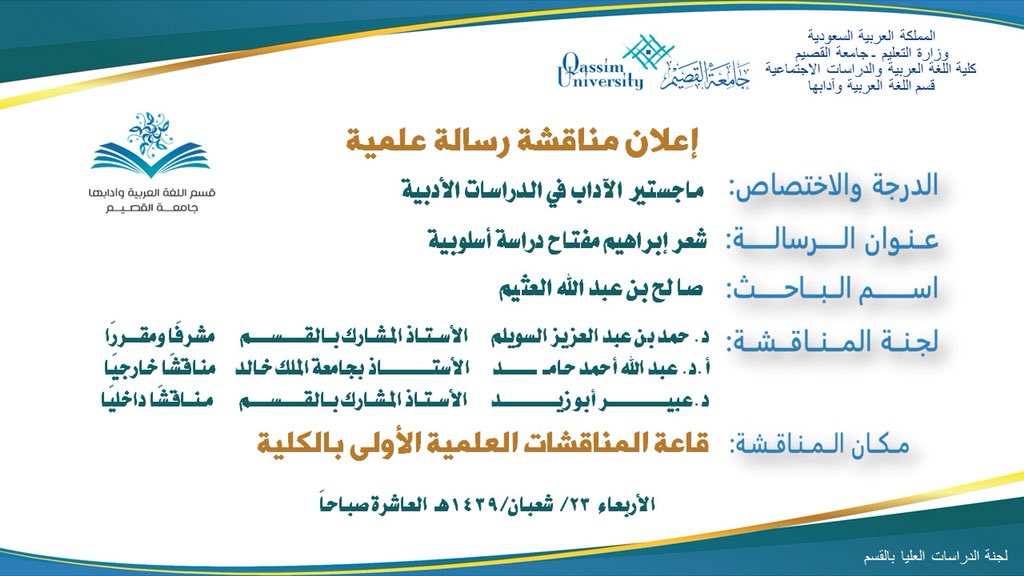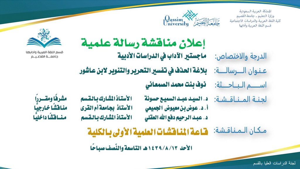 ماجستير جامعة القصيم 1439. تعلن عمادة الدراسات العليا عن بدء التقديم الإلكتروني على برامج الدراسات العليا اعتبارا من الإثنين الموافق 1439 06 03هـ وحتى يوم الأربعاء الموافق 1439 06 19هـ في مرحلتي الماجستير والدكتوراه للعام الدراسي الجامعي 1439 1440هـ. كما أعلنت جامعة القصيم البوابة الإلكترونية أن التسجيل في الدراسات العليا يشمل 80 برنامج أكاديمي في الدراسات العليا من بينهم 62 برنامج على ماجستير جامعة القصيم 1440 و18 برنامج. القبول للدراسات العليا جامعة القصيم. جامعة القصيم وجامعة درم تبحثان زيادة فرص التعاون وحل المعوقات.