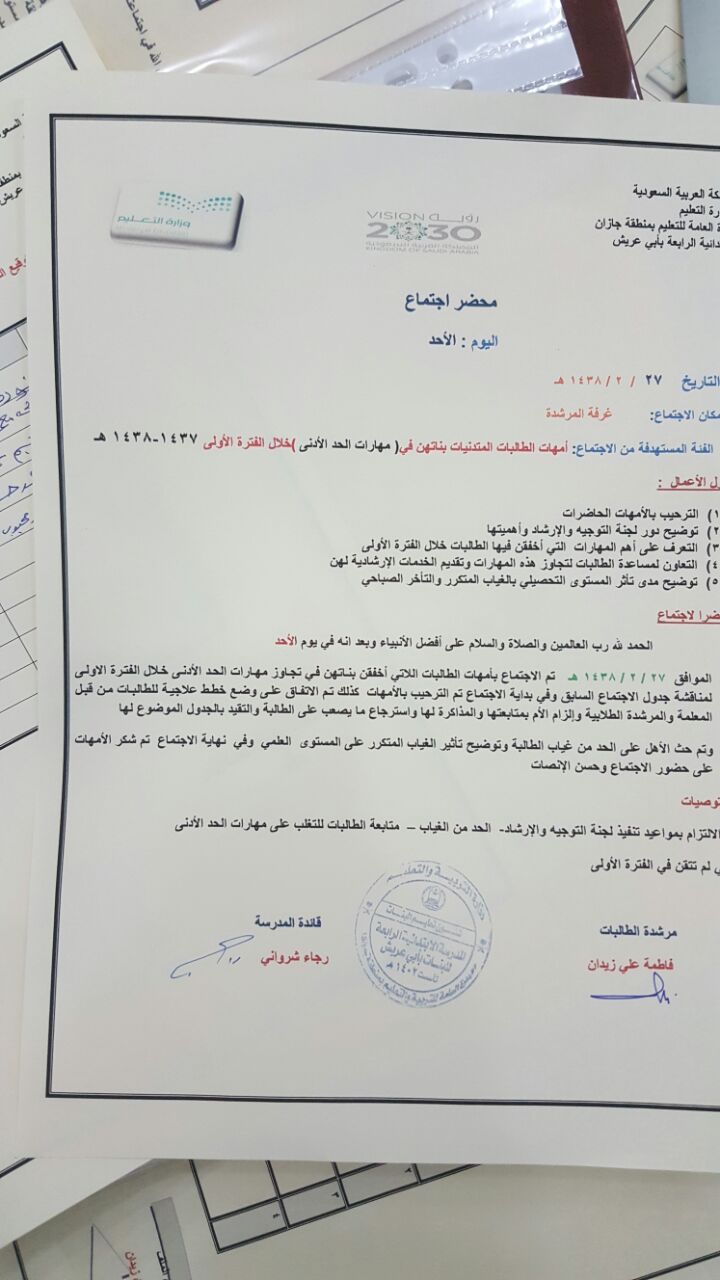 محضر اجتماع لجنة التوجيه والارشاد بالمدرسة 1438